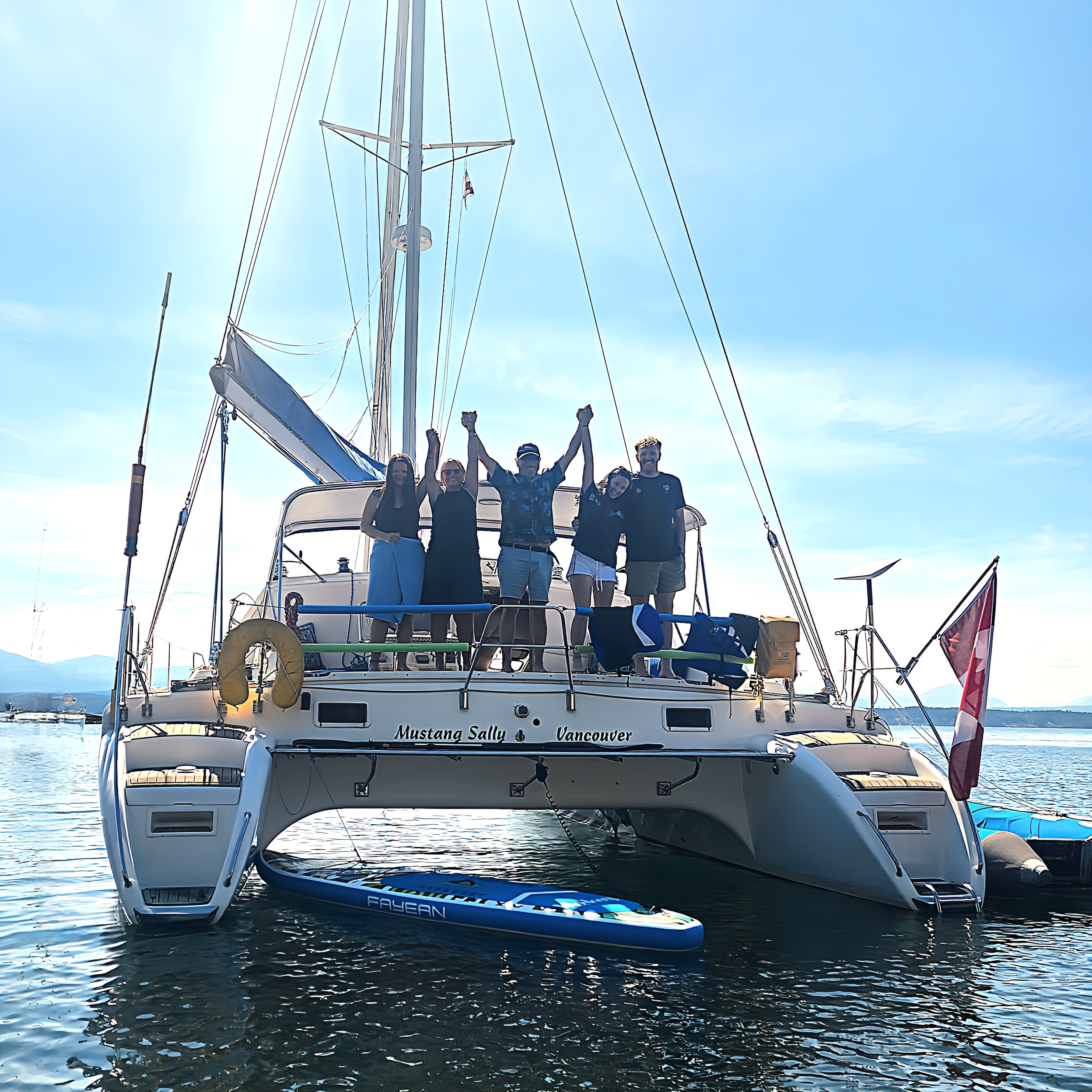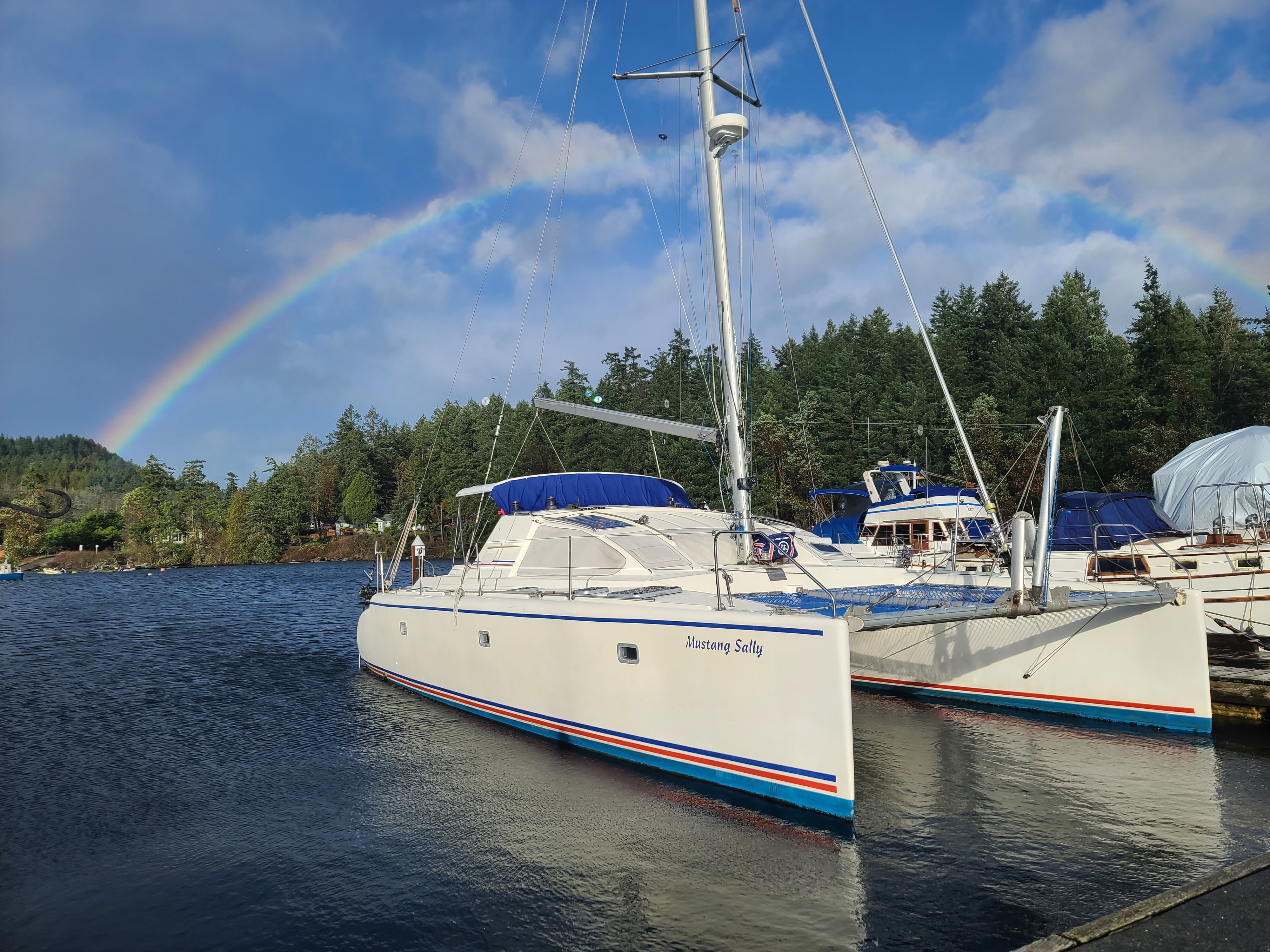 Mustang Sally was manufactured in western France in 1989 For ProKennex by Aquitaine Multicoques. This line of catamarans were designed by Group Gral for the French sports equipment manufacturer ProKennex. ProKennex was an early adapter of carbon fiber for sports equipment and for their catamaran lines. ProKennex catamarans were built from 1988 through to about 1998. The molds were sold to DuFour.